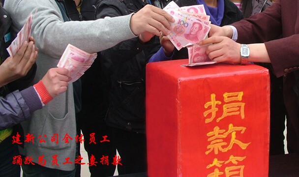 2014年7月1日下午,建新公司簡(jiǎn)單的舉行了“向員工明福濤之妻獻(xiàn)愛(ài)心”的募捐儀式,用一份份真摯的愛(ài)心筑起希望的長(zhǎng)城。當(dāng)建新公司代表把錢親手送到員工手里時(shí),他熱淚盈眶。用深深的一個(gè)鞠躬表達(dá)了對(duì)建新全體員工的感激之情。